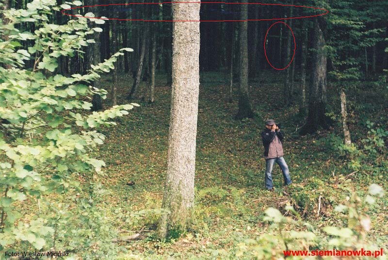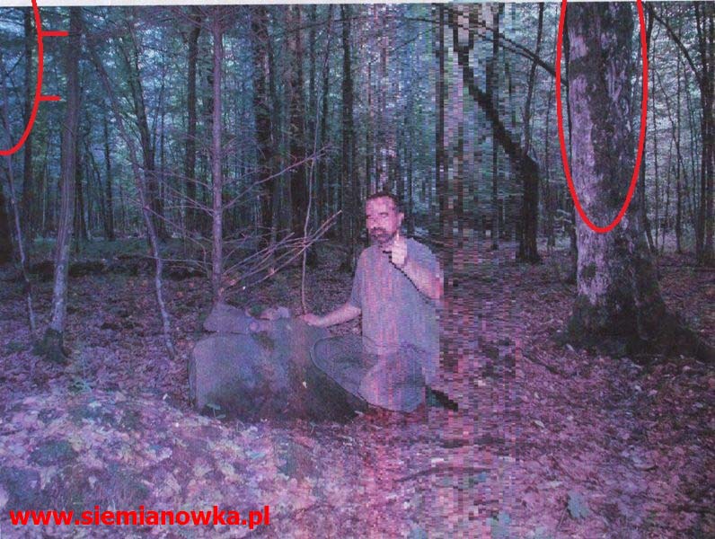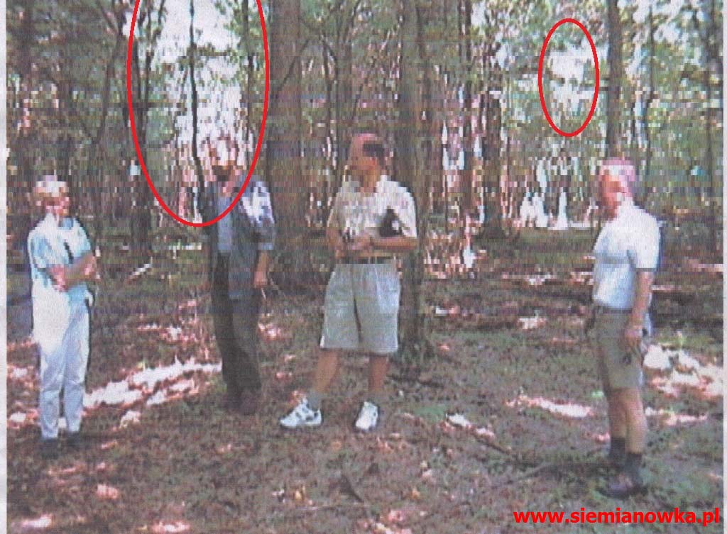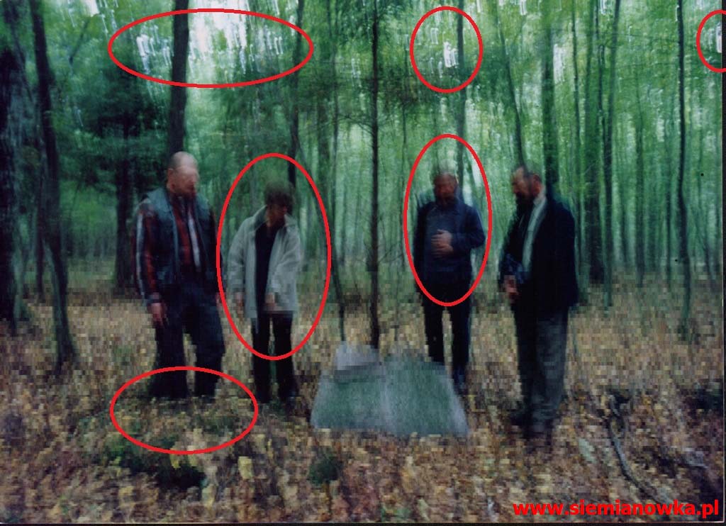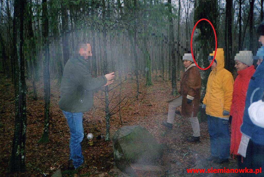 Na zdjęciu "4", na tym samym drzewie, krzyż również jest widoczny. W lewym górnym rogu zdjęcia, w zaznaczeniu, bardzo słabo widoczne są dwie twarze (na wysokości dwóch poziomych kresek). Twarz znajdująca się wyżej (najprawdopodobniej kobiety) patrzy w stronę robiącego zdjęcie. Twarz znajdująca się niżej (starca) patrzy w stronę Jerzego.Na zdjęciu "5" proszę zwrócić uwagę na trzy górne zaznaczenia. Widoczne tam smugi świetlne układają się pod innymi kątami (prawe pionowe, a dalej w lewo coraz bardziej zmieniają kąt nachylenia. Prawdopodobnie są to potoki płynącej energii. Kobieta zachowuje się tak, jakby się od kogoś odpędzała. Jej prawa stopa i stopy mężczyzny z jej lewej strony są niewidoczne. Za Jerzym (drugi z prawej) widoczna jest postać (górna część głowy i ramiona) patrząca w prawo.