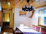 KALINA - na parterze znajduje się duży salon z kominkiem kuchnia ze stołem gościnnym, krzesła oraz telewizor. Pokój zamknięty z dwoma tapczanami, łazienka i sauna. Natomiast na piętrze są dwa pokoje dwuosobowe (łóżka 1 osobowe) i jeden trzyosobowy (łóżko 2 osobowe i tapczan). Kwatera może pomieścić 9 osób.