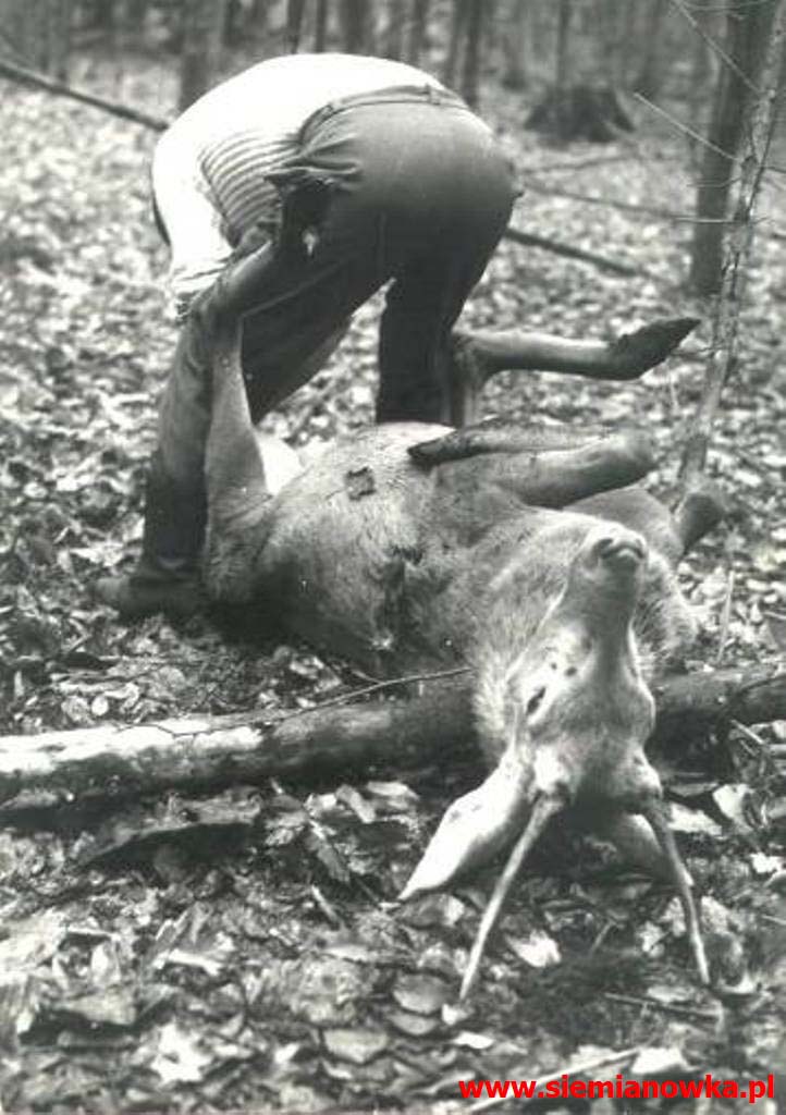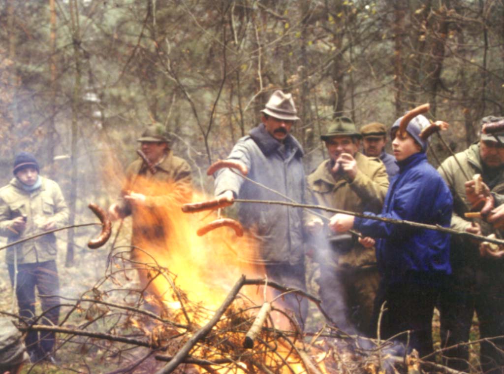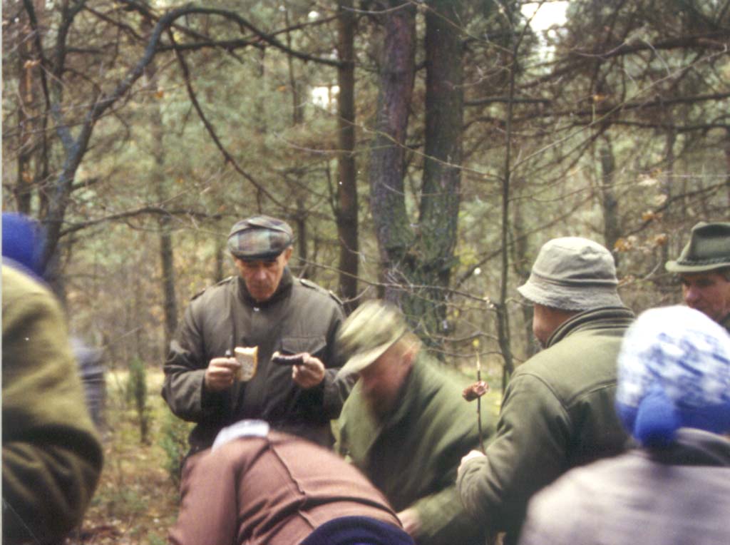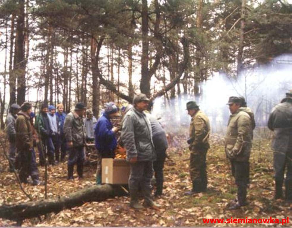 ![Zakończenie polowań zbiorowych w sezonie 2000. Na zdjęciu pierwszy z prawej myśliwy kolega Leszek Smaga, po środku łowczy Aleksy Sawicki i leśniczy Michał Matysiuk]()