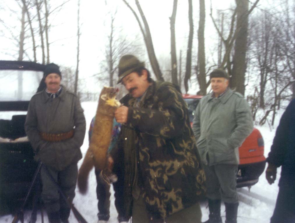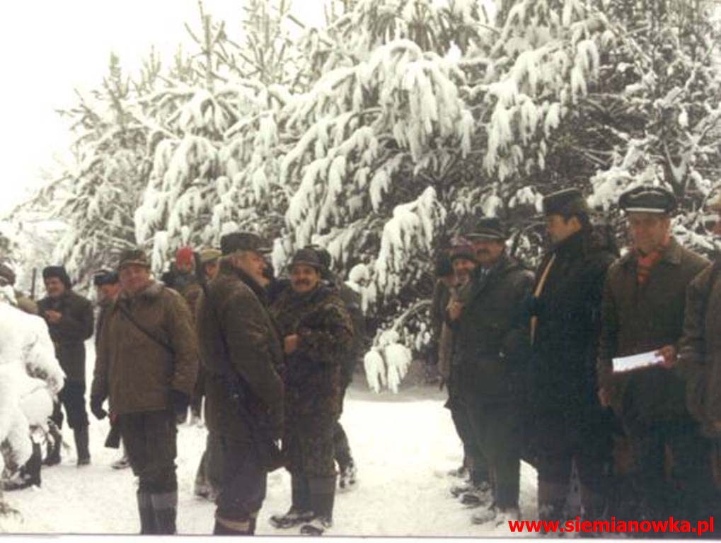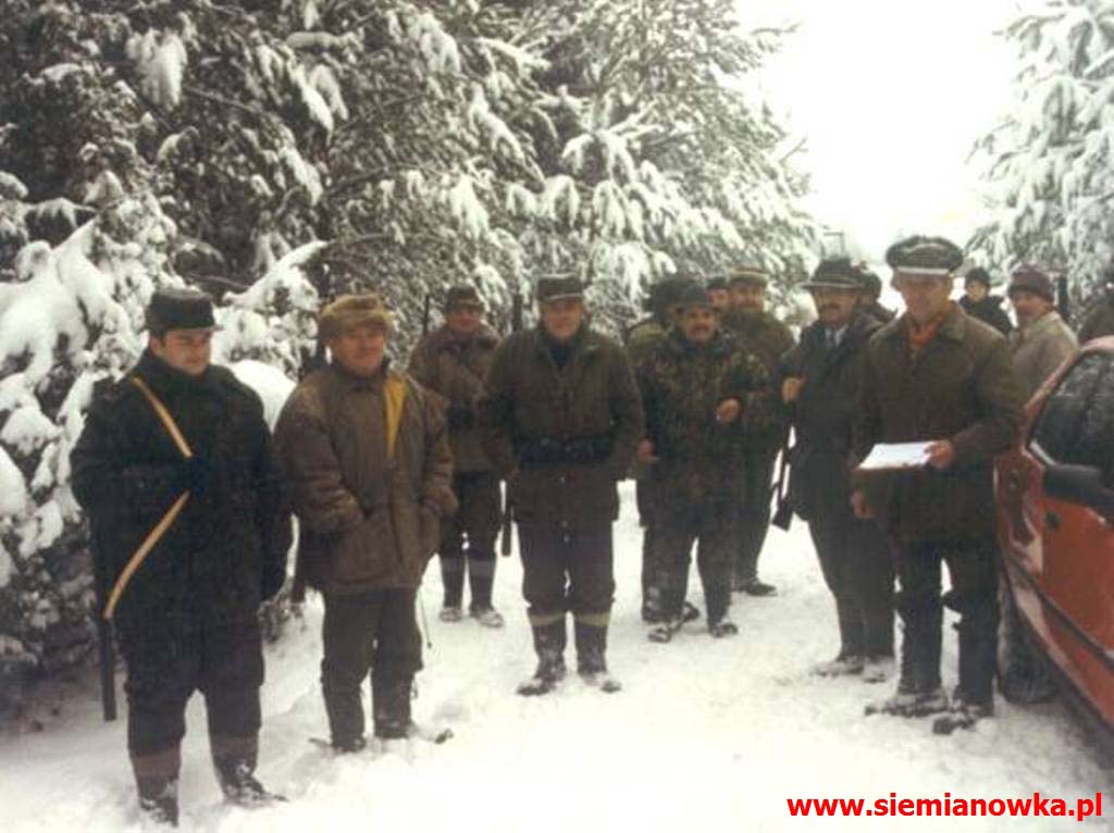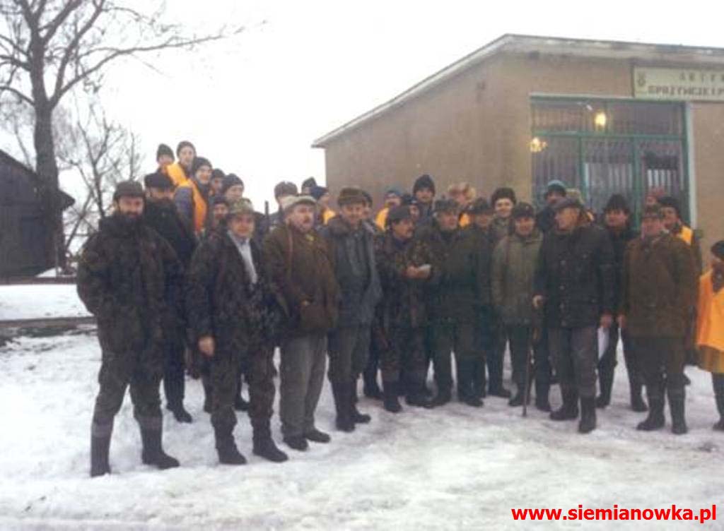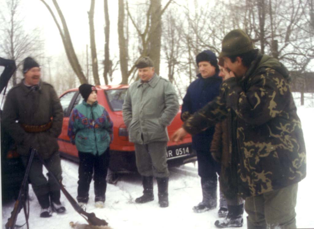 ![Myśliwi na zbiórce do polowania zborowego w obwodzie 100 we wsi Olchówka. Pierwszy od prawej strażnik łowiecki na obwód 100 kolega Jerzy Skiepko, jednocześnie prowadzący polowanie w dniu 3 stycznia 1999 r.]()