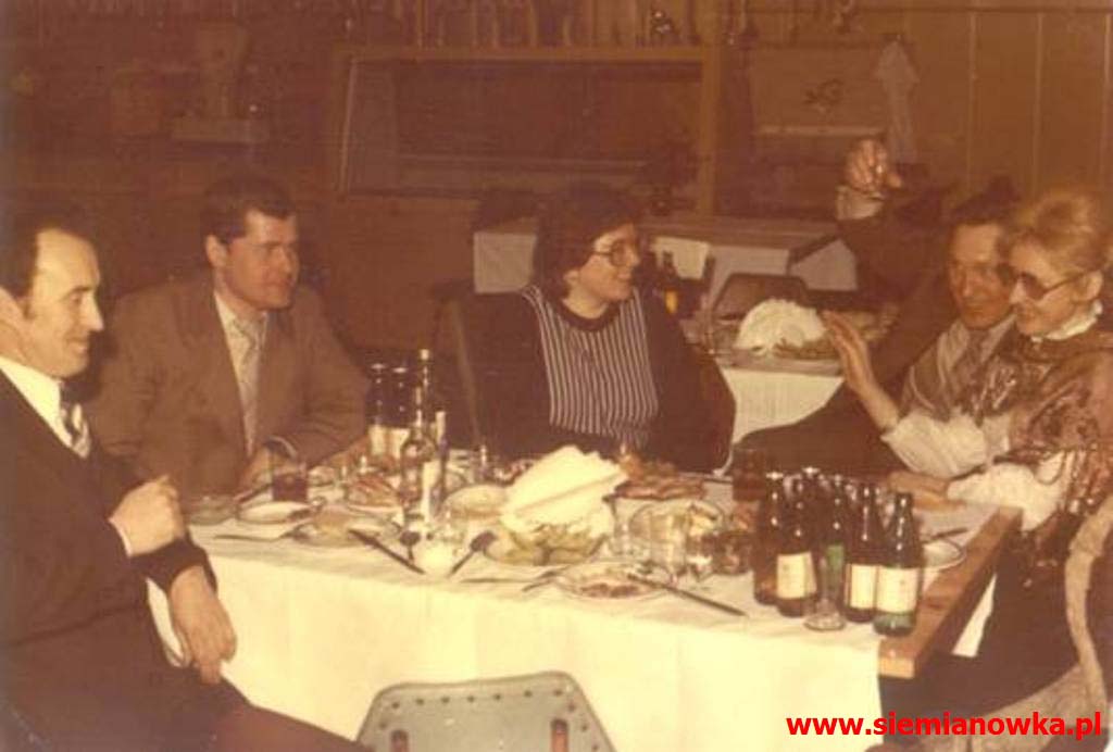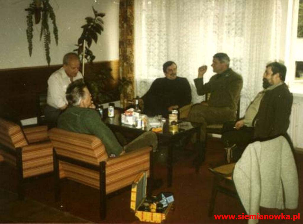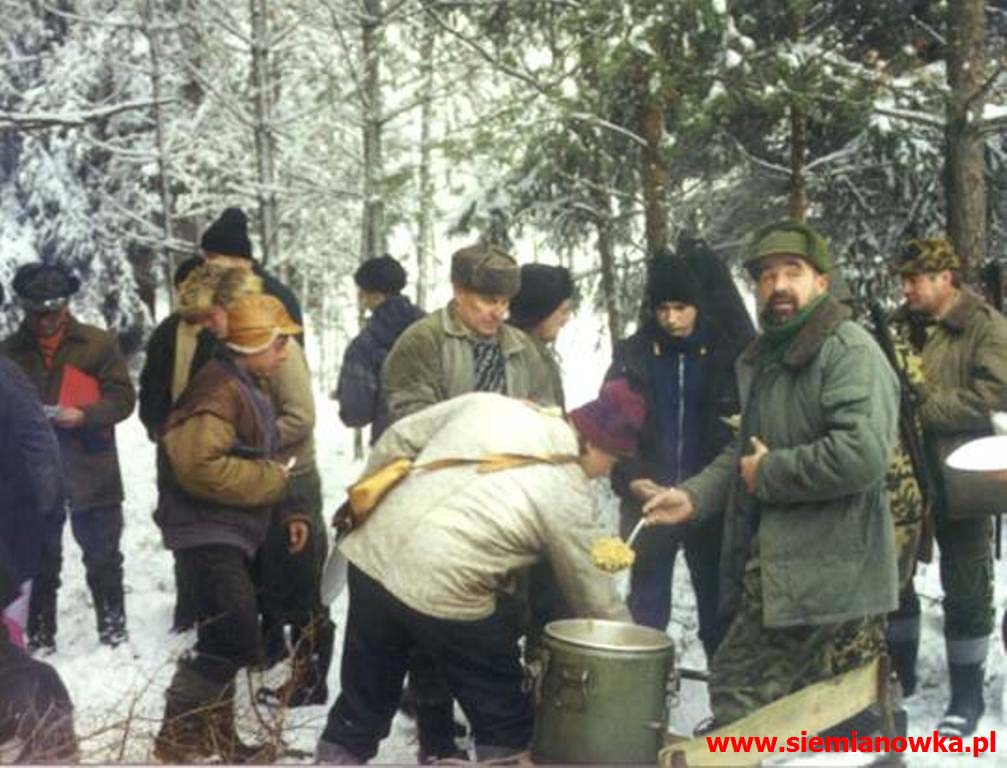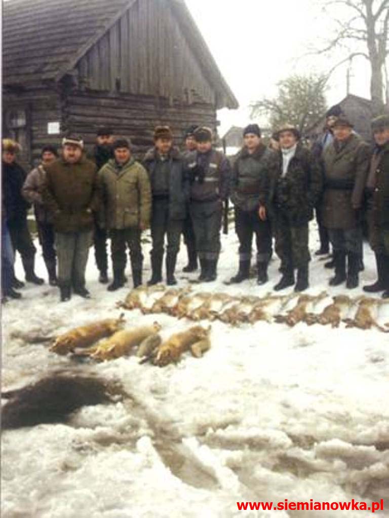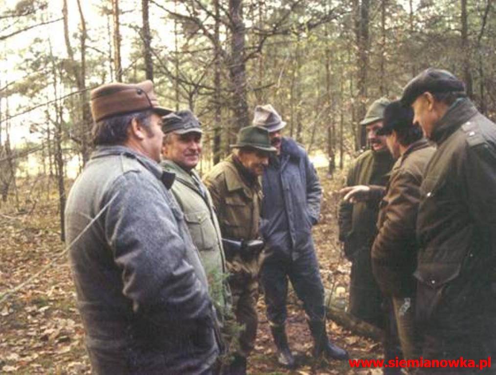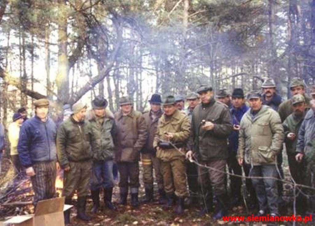 ![Myśliwi na zbiórce do polowania zborowego w obwodzie 100 we wsi Olchówka. Pierwszy od prawej strażnik łowiecki na obwód 100 kolega Jerzy Skiepko, jednocześnie prowadzący polowanie w dniu 3 stycznia 1999 r.]()