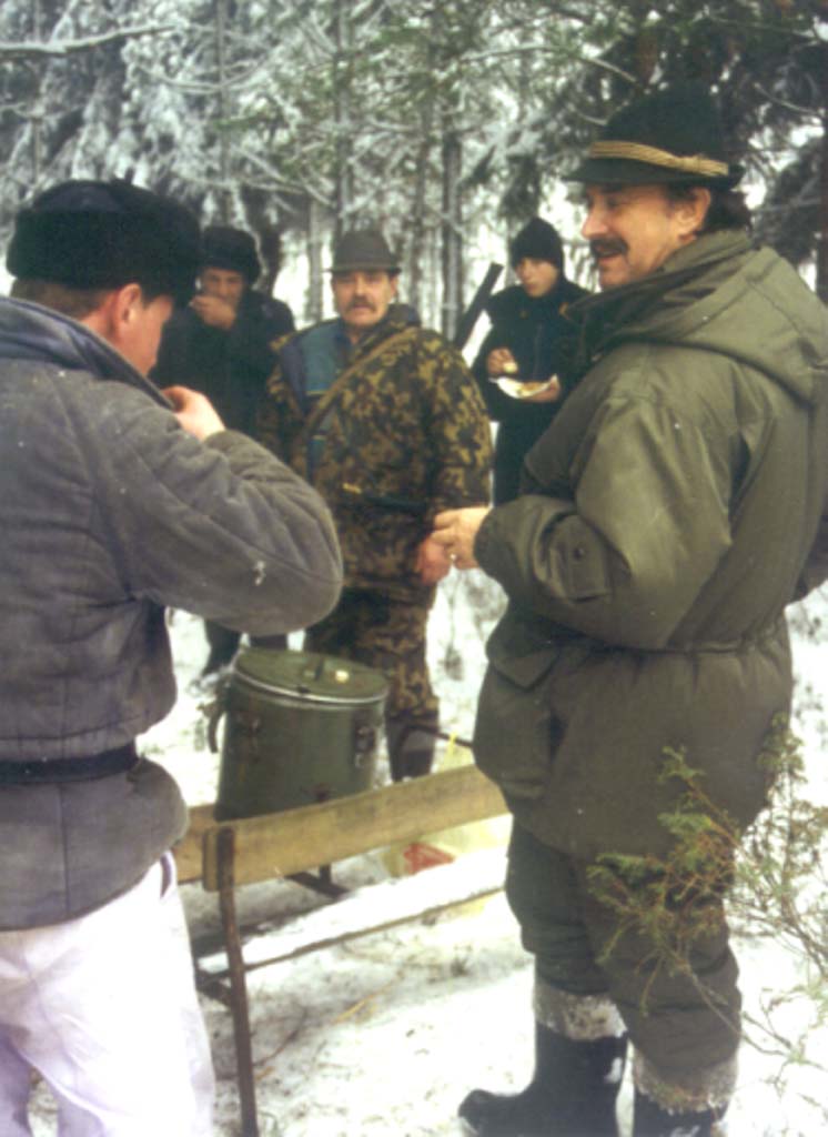 ![Po zakończeniu polowania zbiorowego w obwodzie 92 – wieś Nowa Łuka, 1999 rok]()