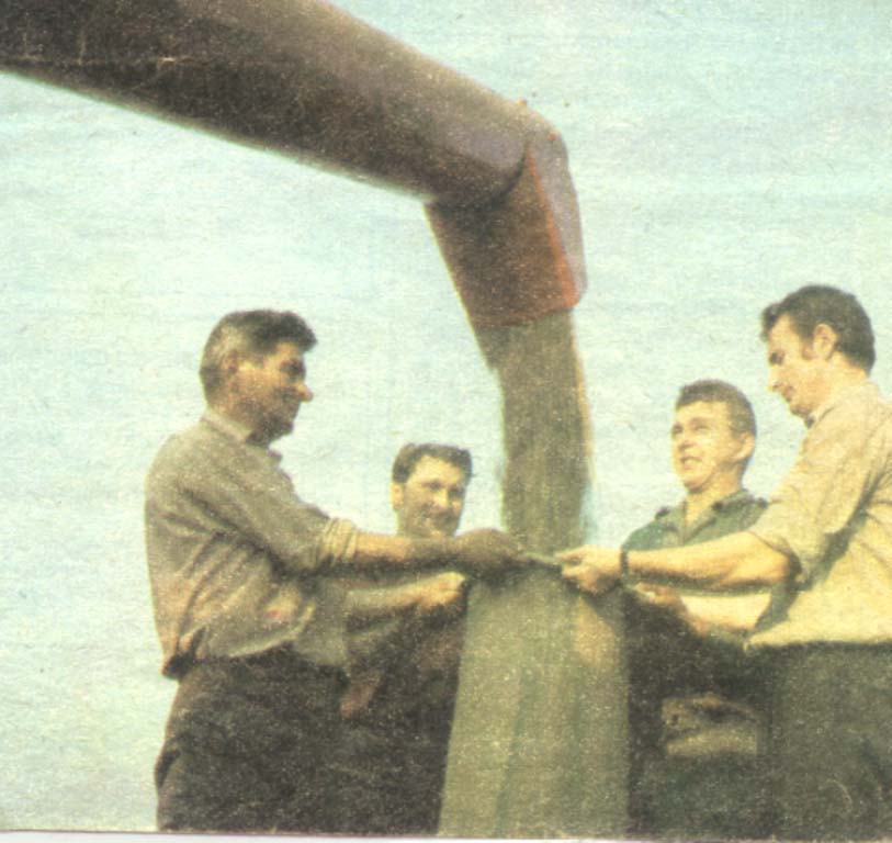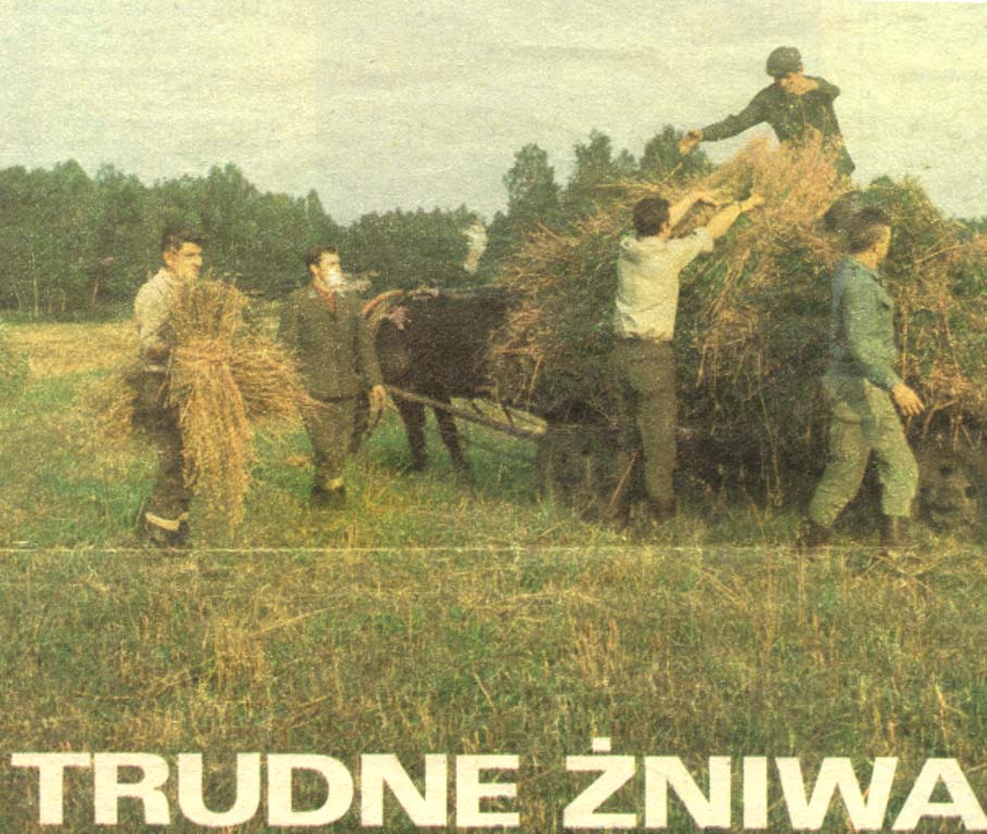 ![Strażnik Koła kolega Stefan Charkiwicz (stoi na wozie) podczas przygotowywania owsa w snopkach do transportu do miejsca zmagazynowania (1973 rok).]()