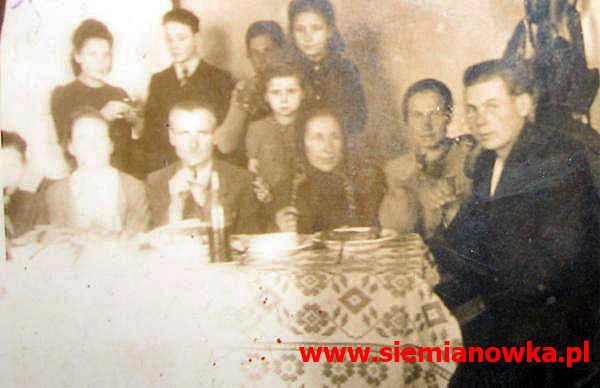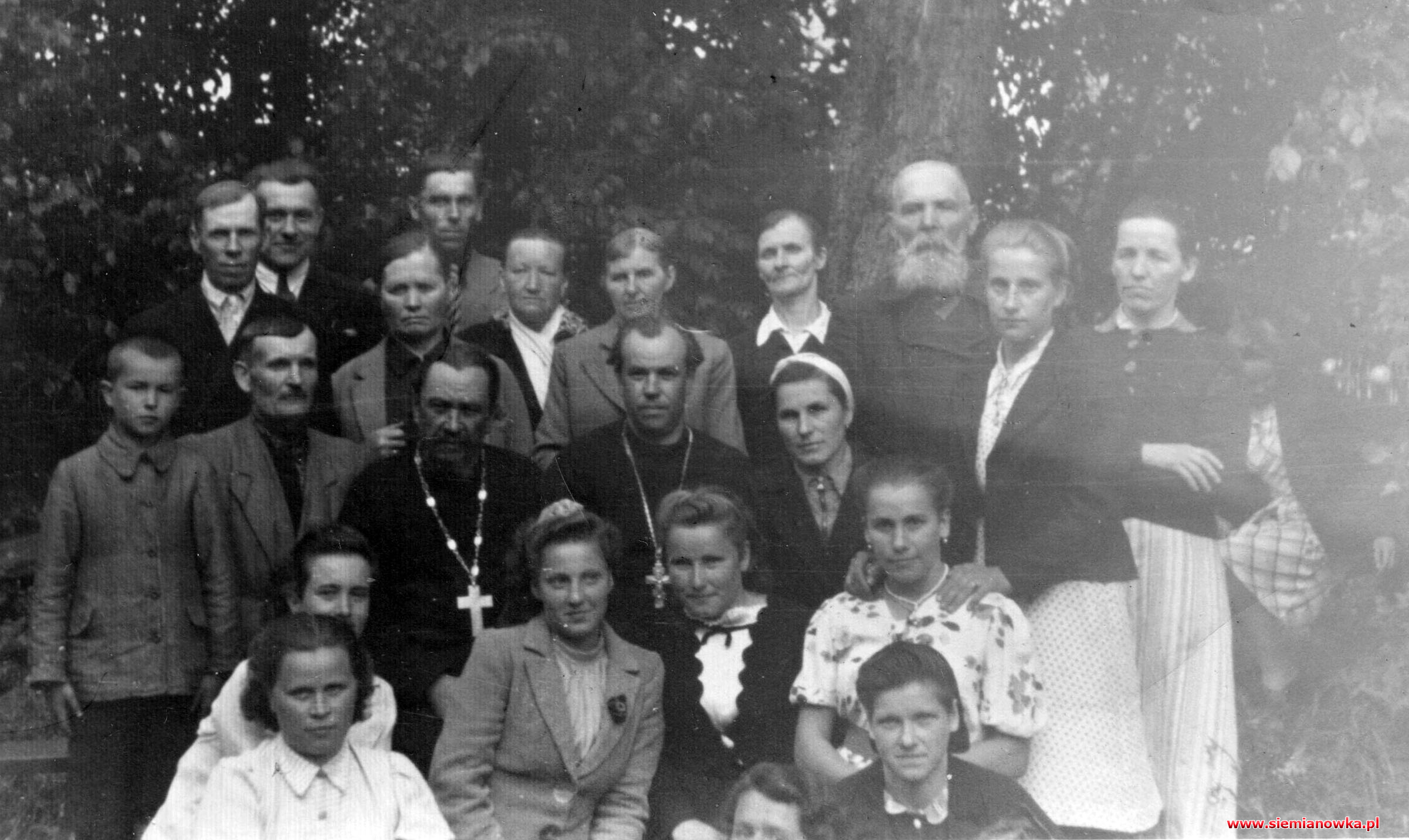 Środkowy rząd od lewej: Michał i Aleksander Gryc (syn i ojciec). Na dole trzecia od lewej Luba Adamiuk (później Bołbot), a piąta (na dole) Walentyna Gryc (później Sajewicz). Dwaj duchowni to ks. Jan Nowik (proboszcz) i ks. Aleksander Nowik (wikary). Zdjęcie zrobione w latach czterdziestych po wojnie.