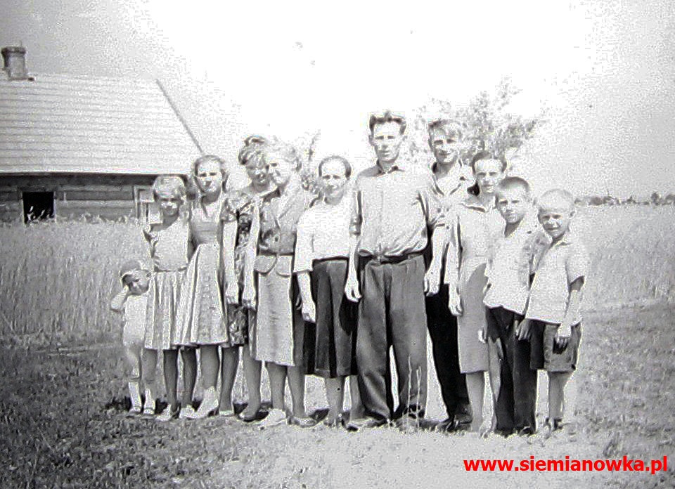 ![Wakacje 1964 roku gdzieś między Lewkowem Starym a Eliaszukami. Rodzina Biryckich (od prawej: Kostek, Szura, Wala, Janek, Konstanty, Wiera, Ola, Marysia, Nina, Zina i Alik). (Foto przekazała Dorota Łangowska)]()