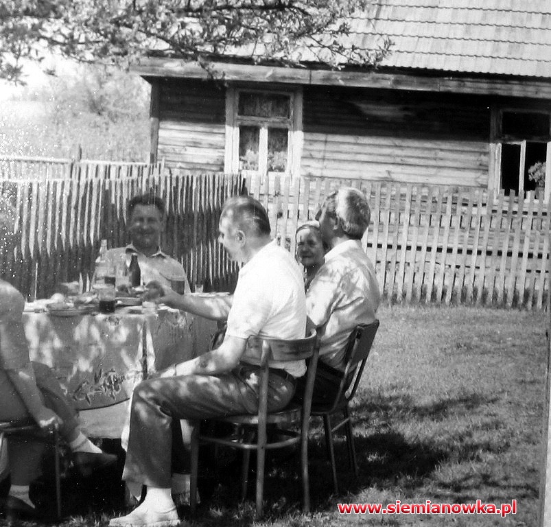 ![Zdjęcie zostało wykonane w roku 1945 w Lewkowie Starym, kiedy Dziadek Konstanty Birycki wrócił z Dachau. Siedzi pierwszy z prawej. Obok Babcia Wiera. (Foto przekazała Dorota Łangowska)]()