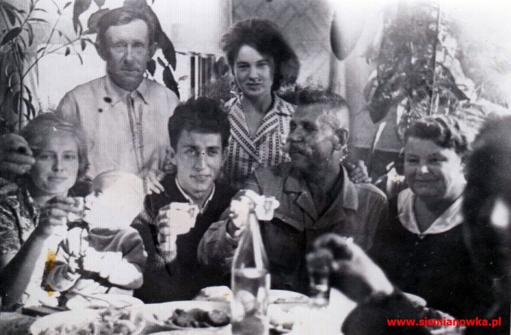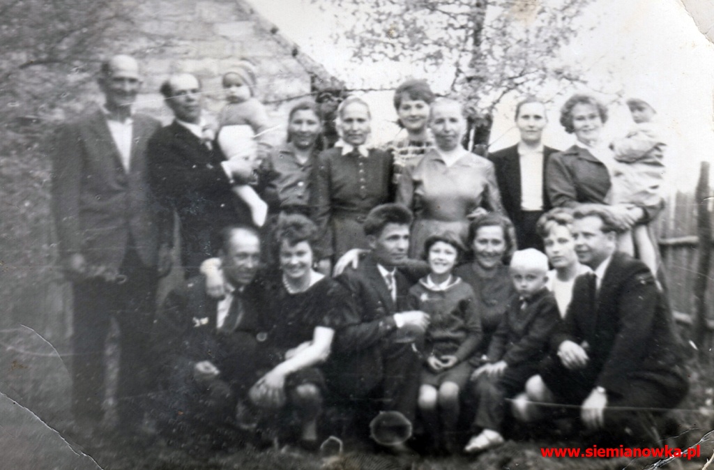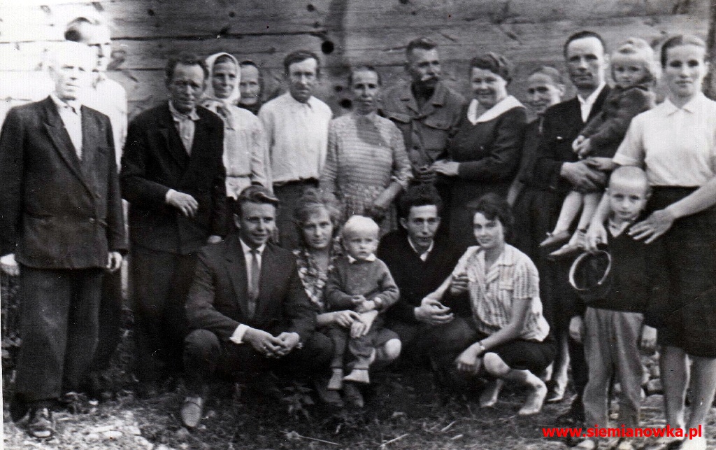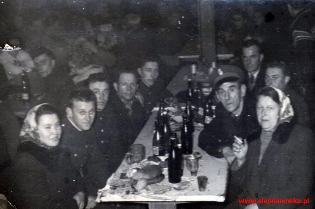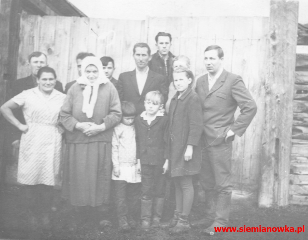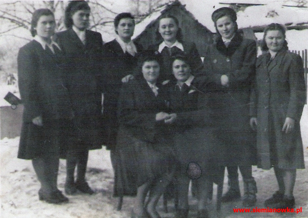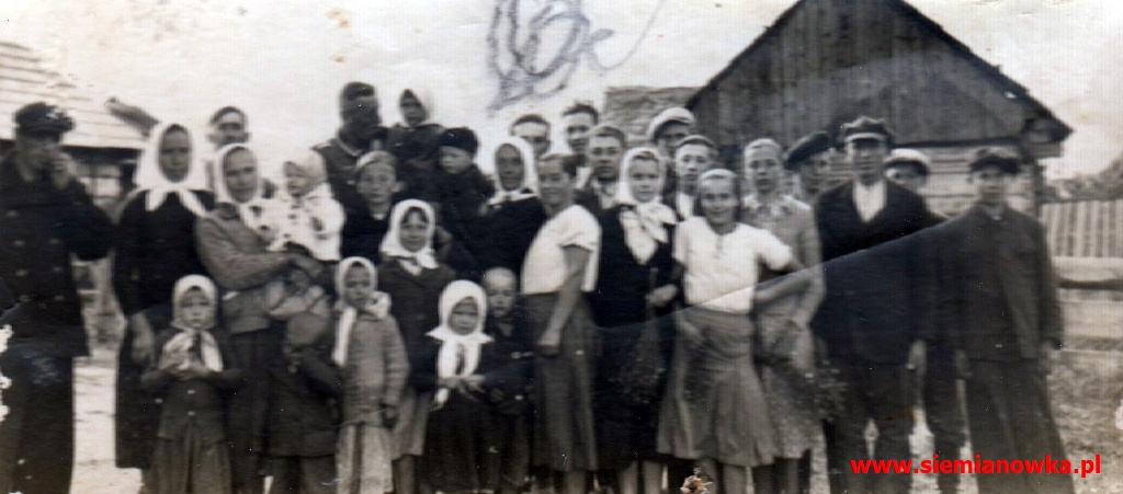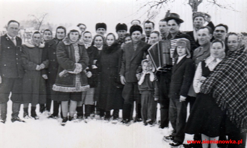 Od lewej: Maria Moroz, ?, Jan Birycki, Maria Kowalewska, Zinaida Szymaniuk, Maria Szymaniuk, ?, Maria Birycka, Wiera Oniśkiewicz, Anastazja Szymaniuk, Anna Mirończuk, ?, ?, ?, ?, Walenty Karpiuk. Siedzą od lewej: ?, Mikołaj Szymaniuk i ?