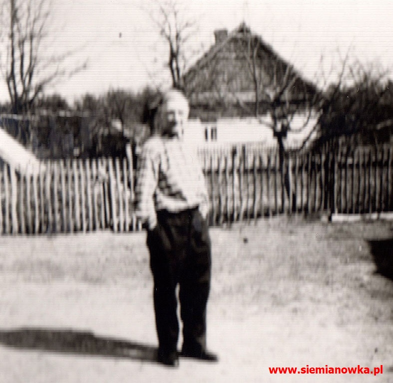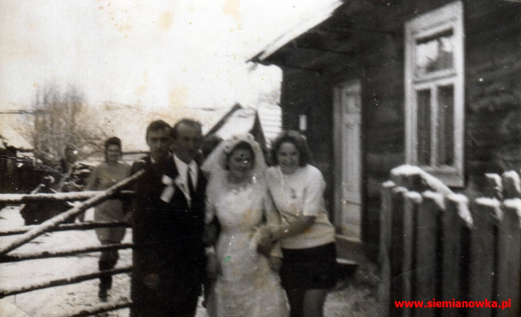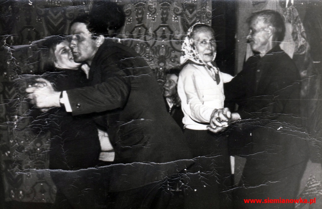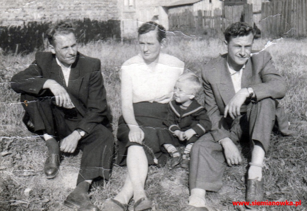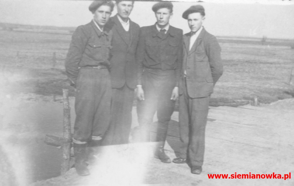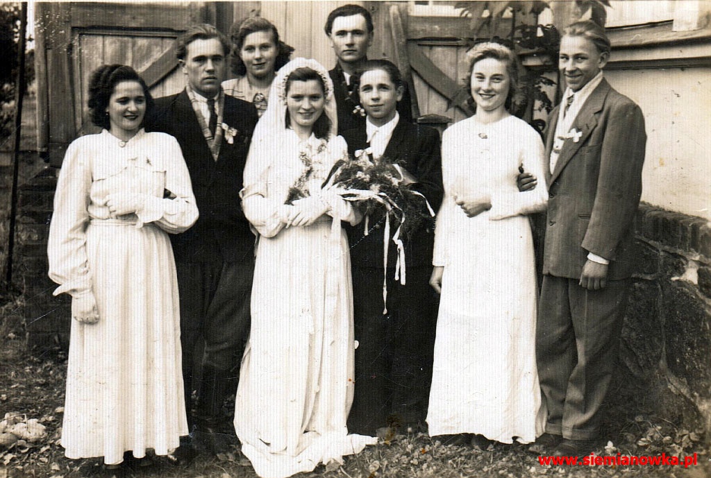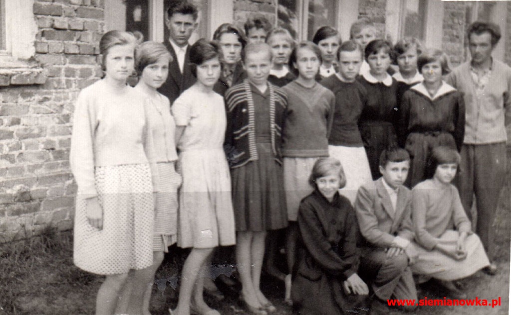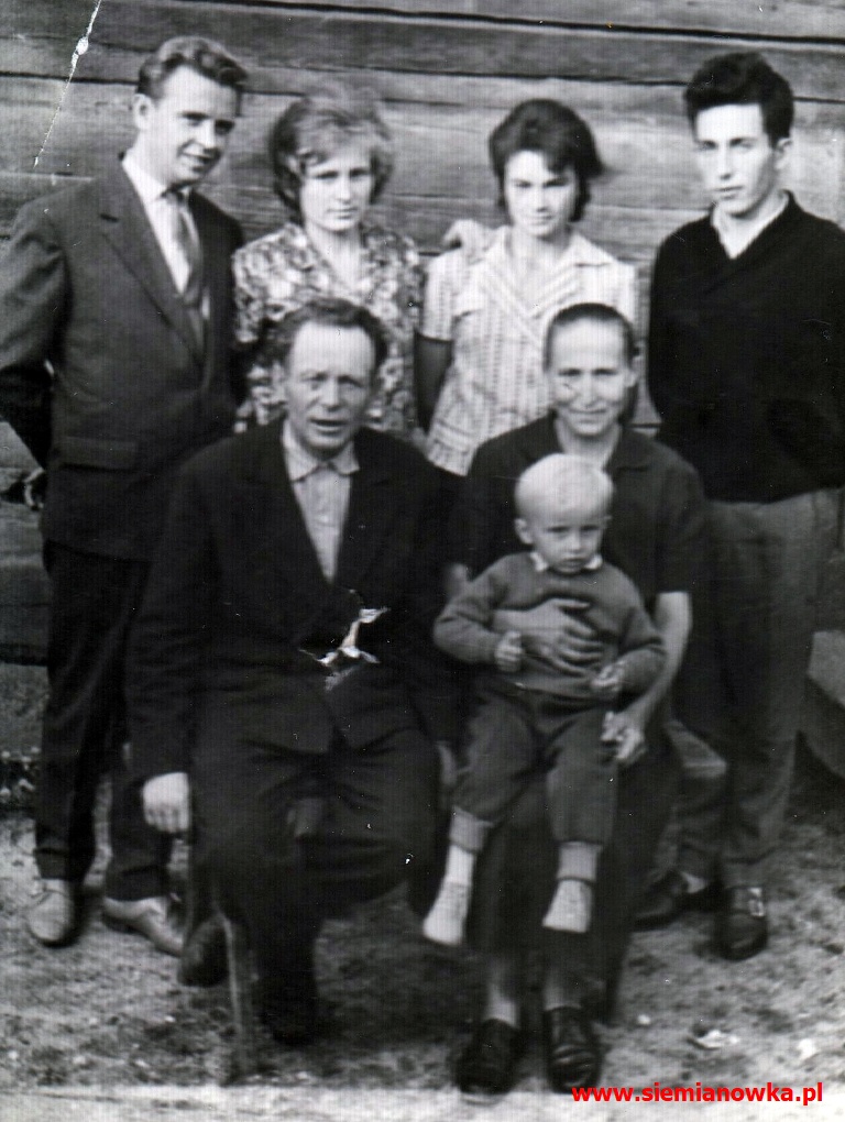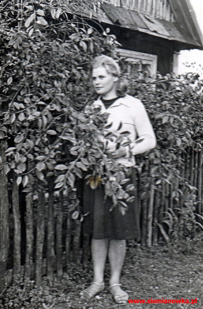 Od lewej: Maria Moroz, ?, Jan Birycki, Maria Kowalewska, Zinaida Szymaniuk, Maria Szymaniuk, ?, Maria Birycka, Wiera Oniśkiewicz, Anastazja Szymaniuk, Anna Mirończuk, ?, ?, ?, ?, Walenty Karpiuk. Siedzą od lewej: ?, Mikołaj Szymaniuk i ?