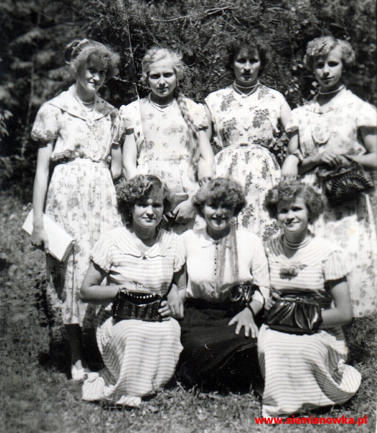 ![Od lewej: Moroz Wala, Magier Ludka, Szymaniuk Maria, Mirończuk Anna, Kowalewska Maria, Moroz Maria, przewodnik, Waśko Maria, Szymaniuk Anastazja, ?, ?, Birycka Maria, ?, Karpiuk Walenty, ?, ?, Szymaniuk Zinaida, ?, ?. Siedzą od lewej: Szymaniuk Mikołaj, ?, ?, ?.]()